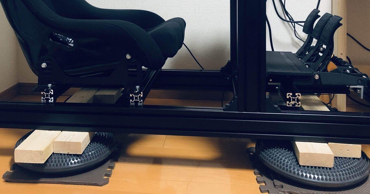 多少、床とコクピットの間に挟み物はしていたんですが、マンションでファナテックPodium DD1の振動が近隣住民に迷惑をかけていないか気になっていたので、こんな風にバランスディスク(ねずみ色のディスク形状の風船)を導入したのが、2021年春ごろでした。