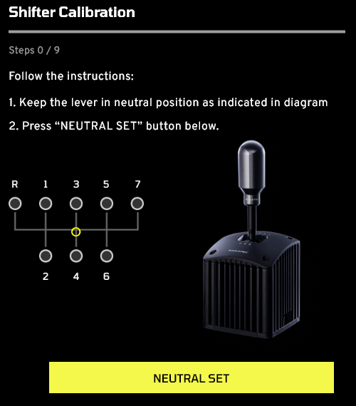 キャリブレーションはこんな感じ。まず、ニュートラルにして、下の黄色いボタンを押す。