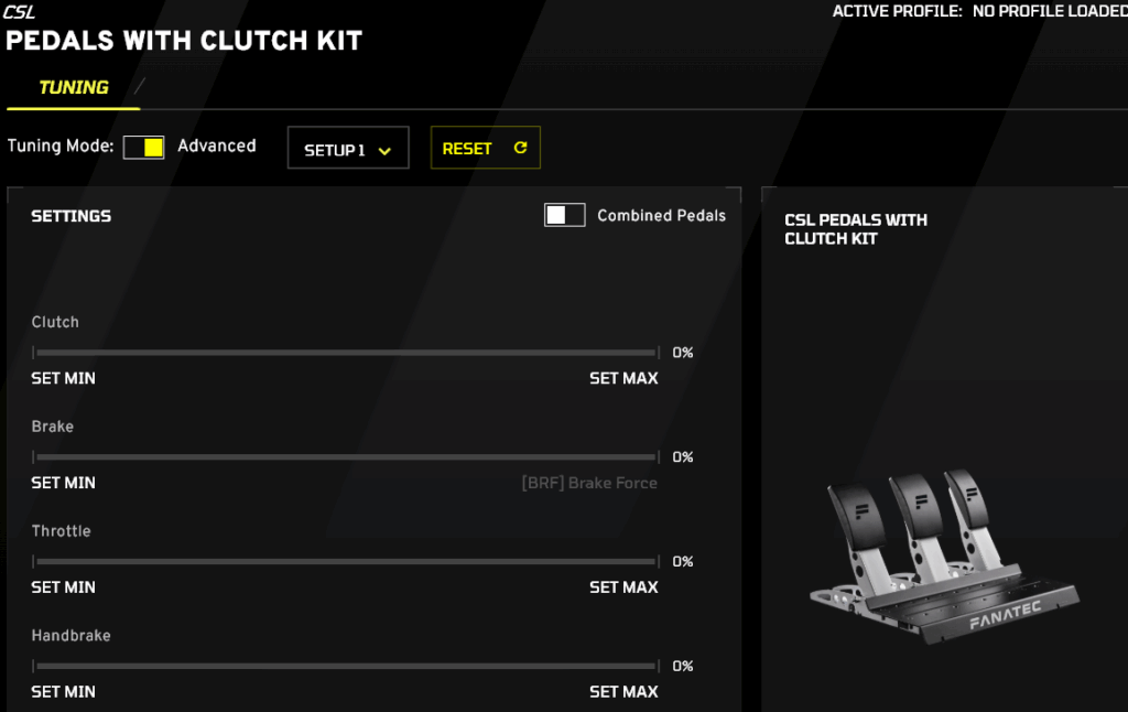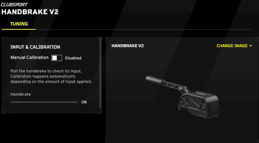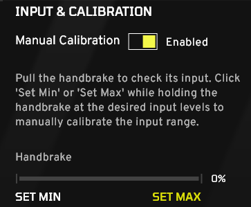 キャリブレーションについては「Manual Calibration」をEnabled(可能)にした方が良さそうです。「SET MIN」「SET MAX」をクリックして、ハンドブレーキの最小、最大を調整してください。