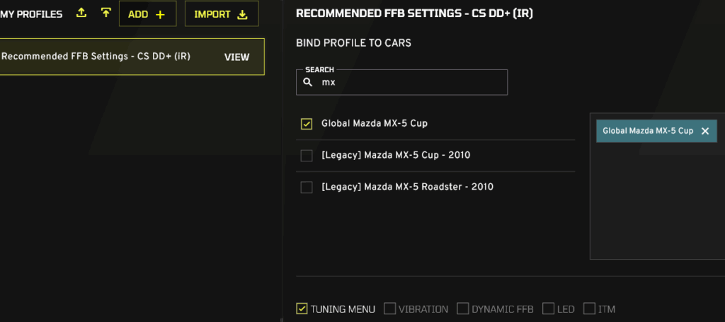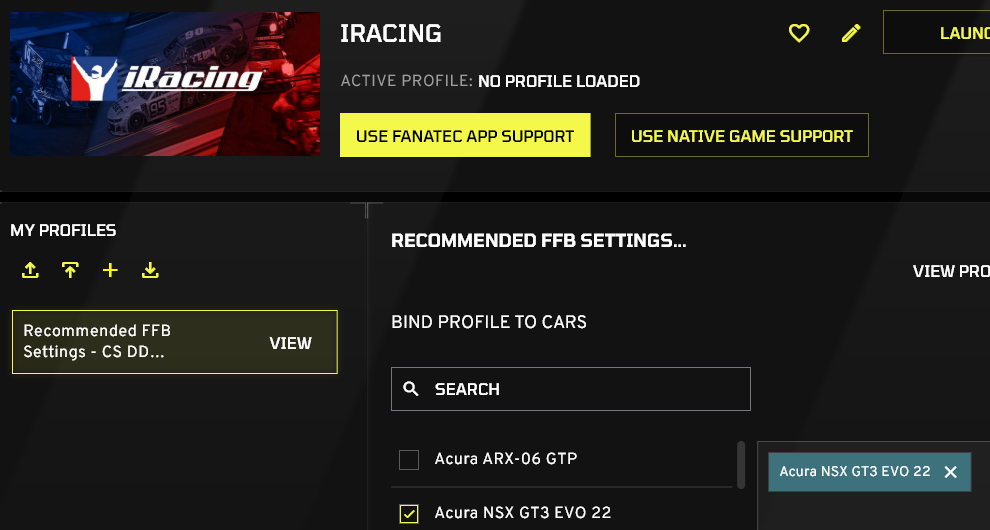 僕の場合は、今回のアプリをインストール直後からプリセットが入っていたらしくこの機能を使うことができました。FANATEC APPにて、以下のような画面の「SEARCH」にて、車を検索し、右下のLOAD(画面から切れていますが)を押すと、推奨FFBだったり、LED発光タイミングが適用されます。