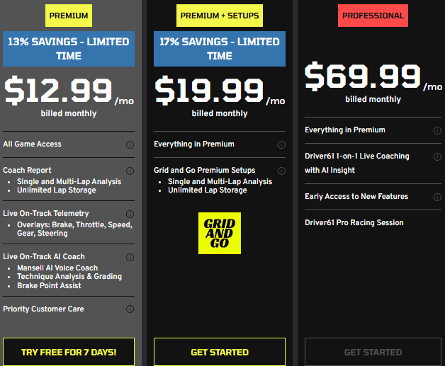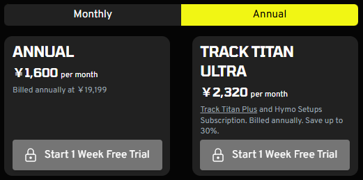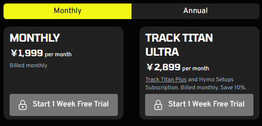 後ろの方で書いておきますが、Track TitanとTrophi.aiという、テレメトリー表示やAiによるコーチングサービス(あと30m手前でブレーキ踏めたとか、Trophi.aiは音声で言ってくれるっぽい)と連携しているようですが、別に他社のハンコンでも同様のサービスは使えそうな気がします。