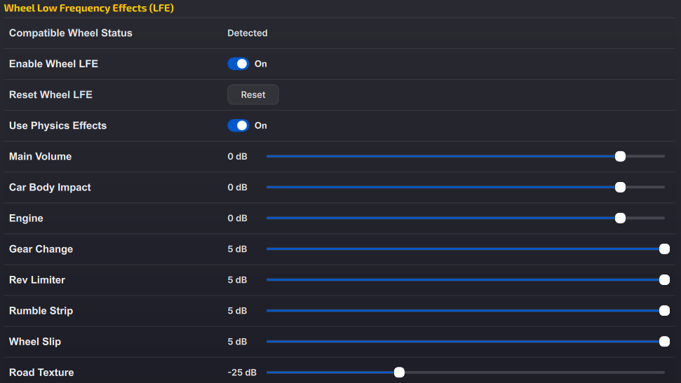 FullForceの振動は、各パラメーターを相対的にどの値にするかが大事かと思います。公式の発表している数値にこだわりたいなら、チェンジログで10dBと推奨されている以外のパラメータを少し下げてやる。その分、Fanatecのステアリングを操作して、FullForceの設定を上げてやる(例えば50%を70%に)等してやればいいのかと思ったり。