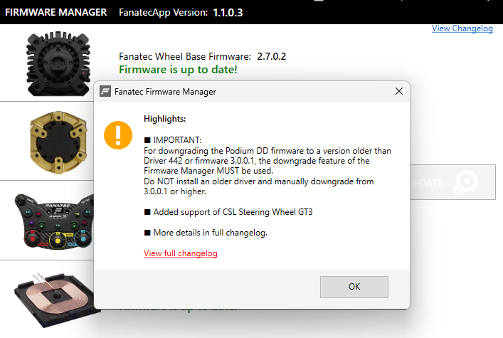 FANATECオーナーの方は何度も見た画面だと思いますが、右上のView Changelogをクリックしたら、このようなウィンドウが出てくるので、赤字のView full changelogをクリックすると、かなり長いチェンジログ(変更点)を確認することができます。