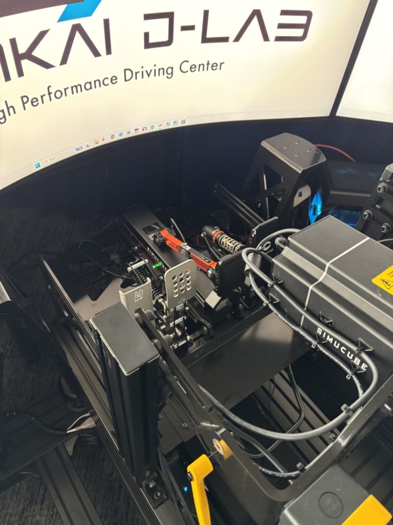 D-LABでは、ステアリングベースに SIMUCUBE、ステアリングに Cube Controls が採用されています。ペダルについては、SIMUCUBEのアクティブペダルがブレーキ。アクセルもSIMUCUBE。クラッチとフットプレートはHEUSINKVELD。という組み合わせです。