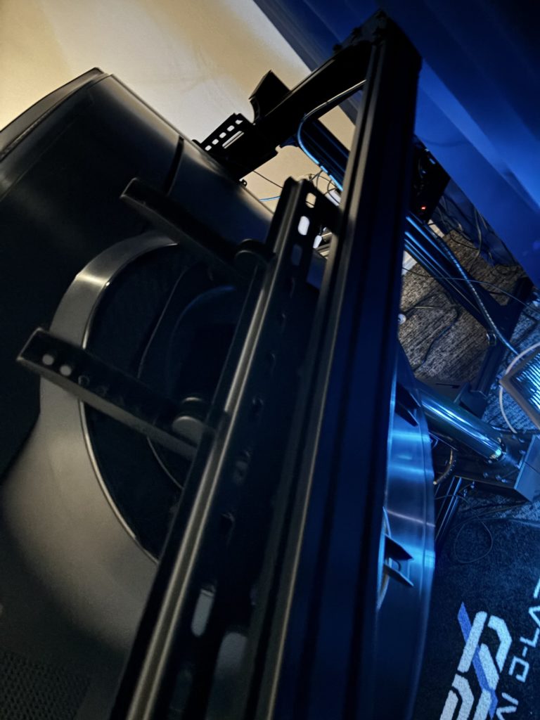今回、画面の固定方法についても写真を撮らせてもらいました。55インチを支えてるのは一般的なテレビ用?の金具でしたね。また結構な厚みの鉄製のプレート(暗くて見えませんね)を使用して、隣のアルミフレームを接合しています。55インチ3画面、参考にしたい方、どうぞw